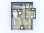 Spacious sleeping accommodation awaits you with 4 bright and roomy bedrooms. The main floor master bedroom has a king sized bed and a TV. It opens onto an attached ensuite bath with a big shower and a deep, jetted tub. Upstairs, one bedroom has a queen bed, TV, and an attached ensuite bath. The other two bedrooms have two twin beds and a TV each and they share a hall bath with tub and shower.